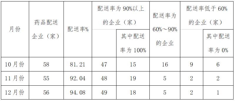 为进一步压实集采(挂网)药品生产企业供应保障的主体责任,确保医疗机构临床使用需求,督促配送企业及时响应医疗机构采购订单,提高配送时效,及时处理医疗机构反映的供应配送问题,对无法及时满足医疗机构采购需求、不按协议供应的医药企业,依据相关管理规定给予相应信用评价,现就关于全省第四季度药品配送情况进行通报如下。
